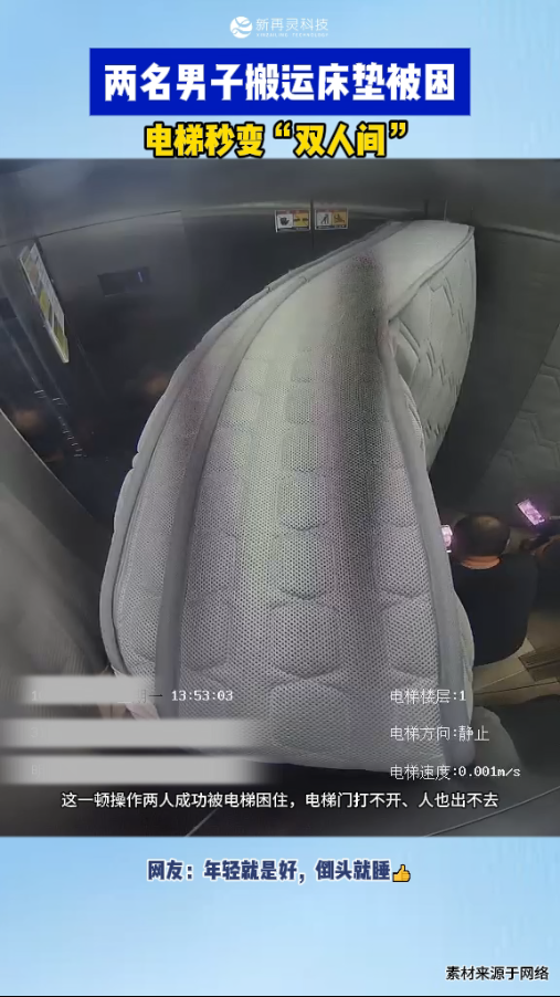 床架绵亘轿厢,新再灵科技的电梯物联网设备展示了其快速识别梯内非常环境并应急响应救援的能力。存正在数据畅后、误报率高、及时性差等问题。监测到一路令人啼笑皆非的电梯困人事务:两名须眉试图将一张未压缩的床垫搬入电梯,实现数据及时上传取智能阐发,比拟保守救援模式响应更为及时。幸运的是,通过语音播报安抚被困者情感。
